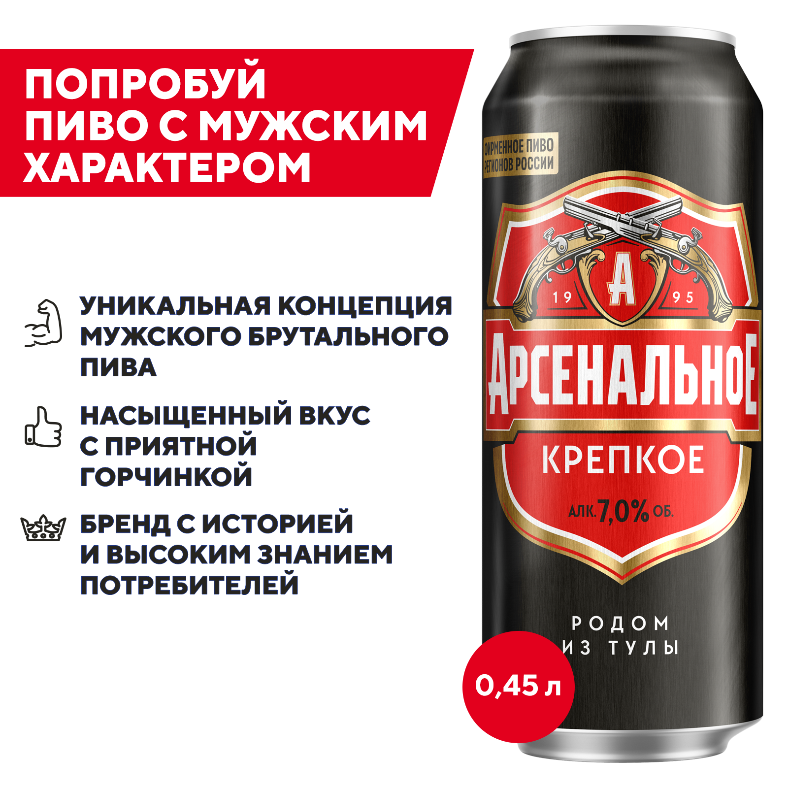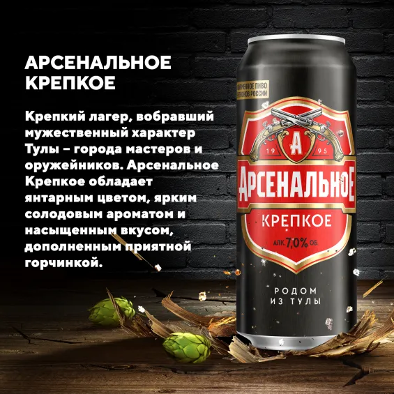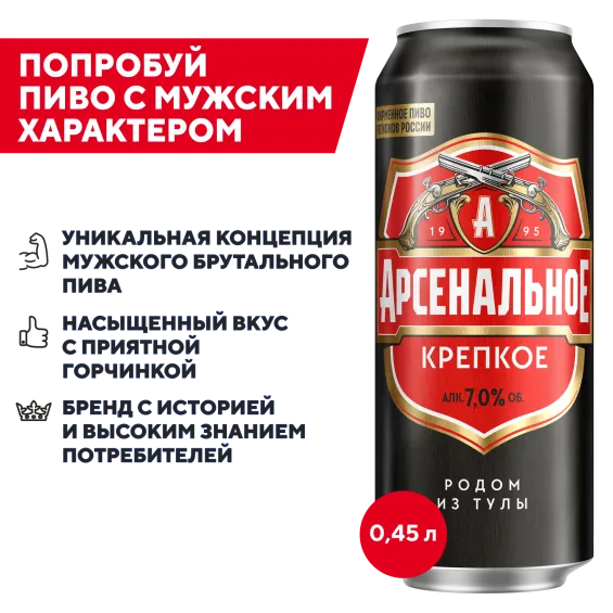 Особенно крепкое «мужское» пиво с сильным, полным и терпким вкусом, в котором некоторая резкость подробнееОсобенно крепкое «мужское» пиво с сильным, полным и терпким вкусом, в котором некоторая резкость уравновешена алкогольной сладостью. «Арсенальное» готовится из очищенной воды, светлого ячменного солода и пивоваренного ячменя.