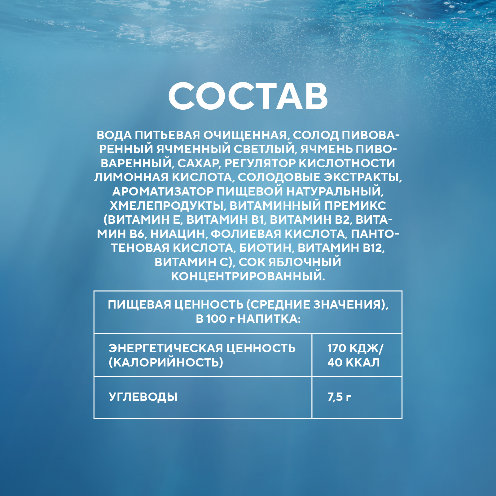 вода питьевая очищенная, солод пивоваренный ячменный светлый, ячмень пивоваренный, сахар, регулятор кислотности лимонная кислота, солодовые экстракты, ароматизатор пищевой натуральный, хмелепродукты, витаминный премикс (витамин Е, витамин В1, витамин В2, витамин В6, ниацин, фолиевая кислота, пантотеновая кислота, биотин, витамин В12, витамин С), сок яблочный концентрированный.