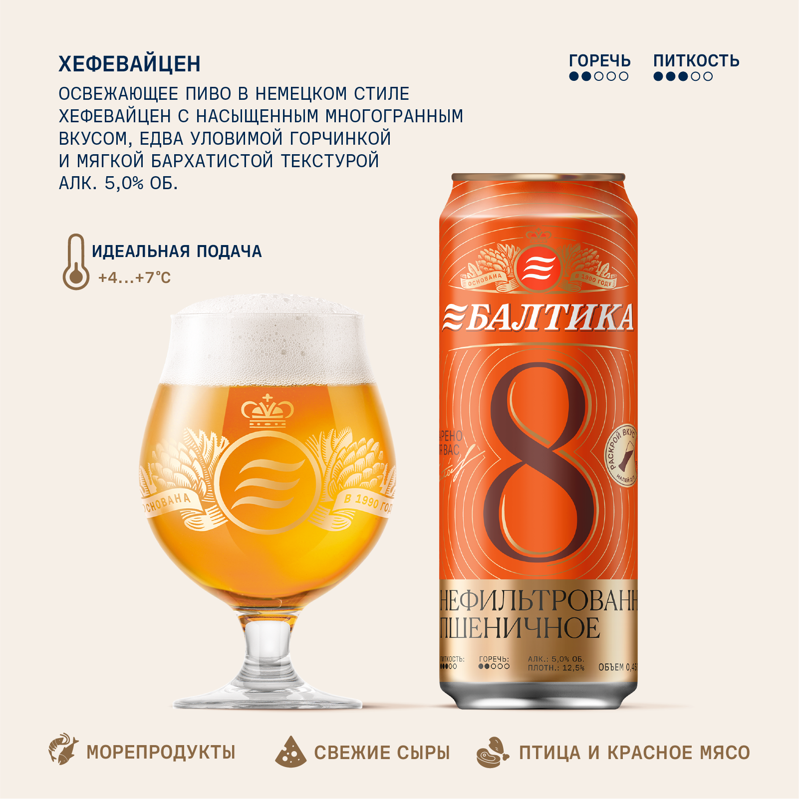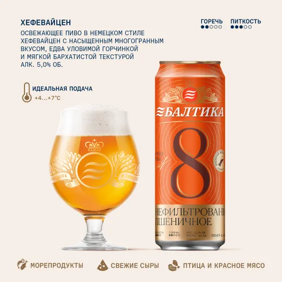 Балтика 8 - это пшеничное нефильтрованное пиво с насыщенным многогранным вкусом, едва уловимой