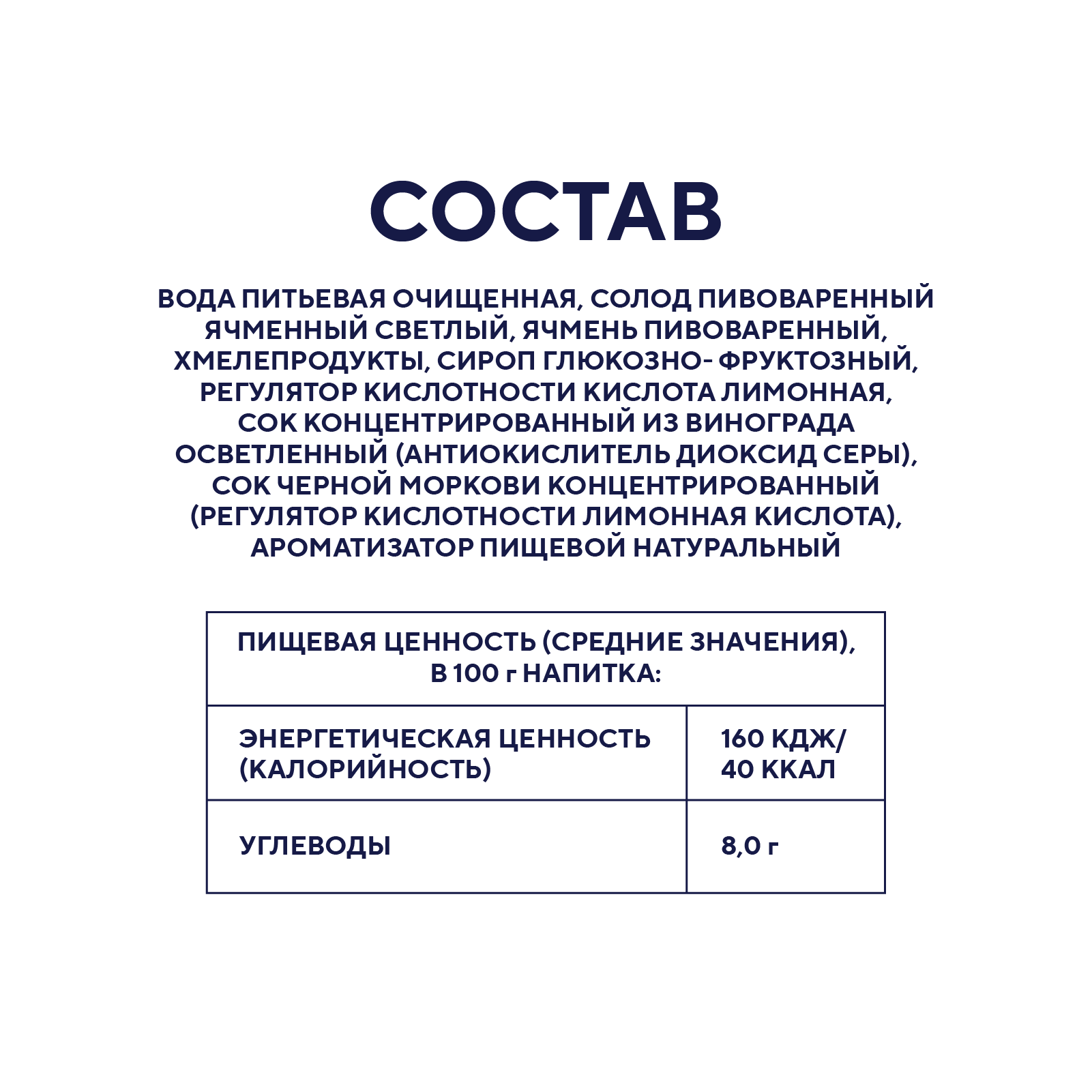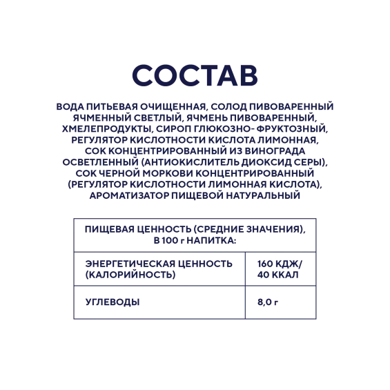 вода питьевая очищенная, солод пивоваренный ячменный светлый, хмелепродукты, сироп глюкозно- фруктозный, кислота лимонная, сок концентрированный из винограда осветленный (антиокислитель диоксид серы), сок черной моркови концентрированный (регулятор кислотности лимонная кислота), ароматизатор пищевой натуральный, ячмень пивоваренный.