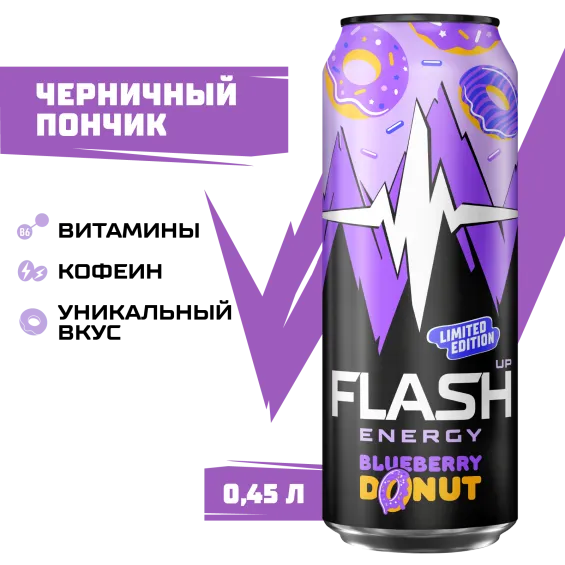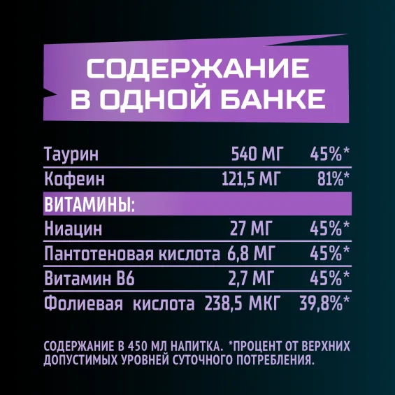 вода питьевая очищенная, сахар, регуляторы кислотности: лимонная кислота и цитрат натрия, концентрат для напитков «Энерджимикс» (таурин, витамин С, мальтодекстрин, кофеин, ниацин, пантотеновая кислота, витамин B6, фолиевая кислота), ароматизатор пищевой эмульсионный «Ваниль» (стабилизаторы: Е414, Е444, Е445), ароматизаторы пищевые, сок концентрированный из черники, красители: Е122 и Е133, консерванты: сорбат калия и бензоат натрия.