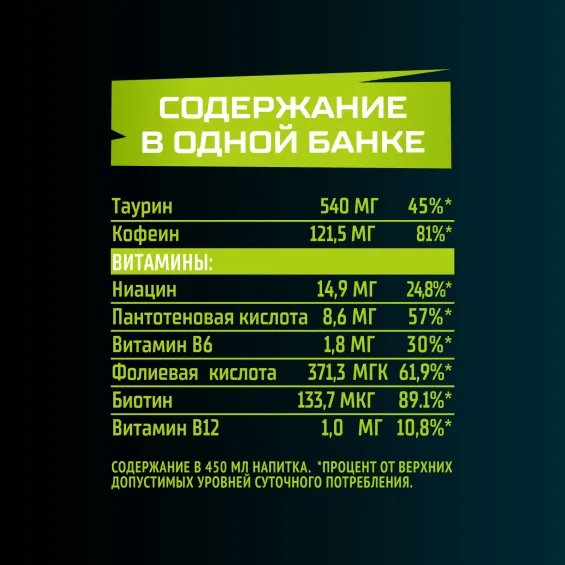 вода питьевая очищенная, сахар, регуляторы кислотности: кислота лимонная и цитрат натрия, БАД «Таурин», натуральные вкусоароматические вещества, масло мяты, ароматизатор пищевой натуральный «Тип Лайм», ароматизатор пищевой натуральный «Нейтральная эмульсия» (стабилизатор Е414, антиокислители E307 и E320, консервант Е202, регулятор кислотности Е330), антиокислитель – аскорбиновая кислота, экстракт растительный «Кофеин натуральный», премикс витаминный (ниацин, пантотеновая кислота, витамин В6, фолиевая кислота, биотин, витамин В12), консервант – бензоат натрия, концентрированный сок лайма.