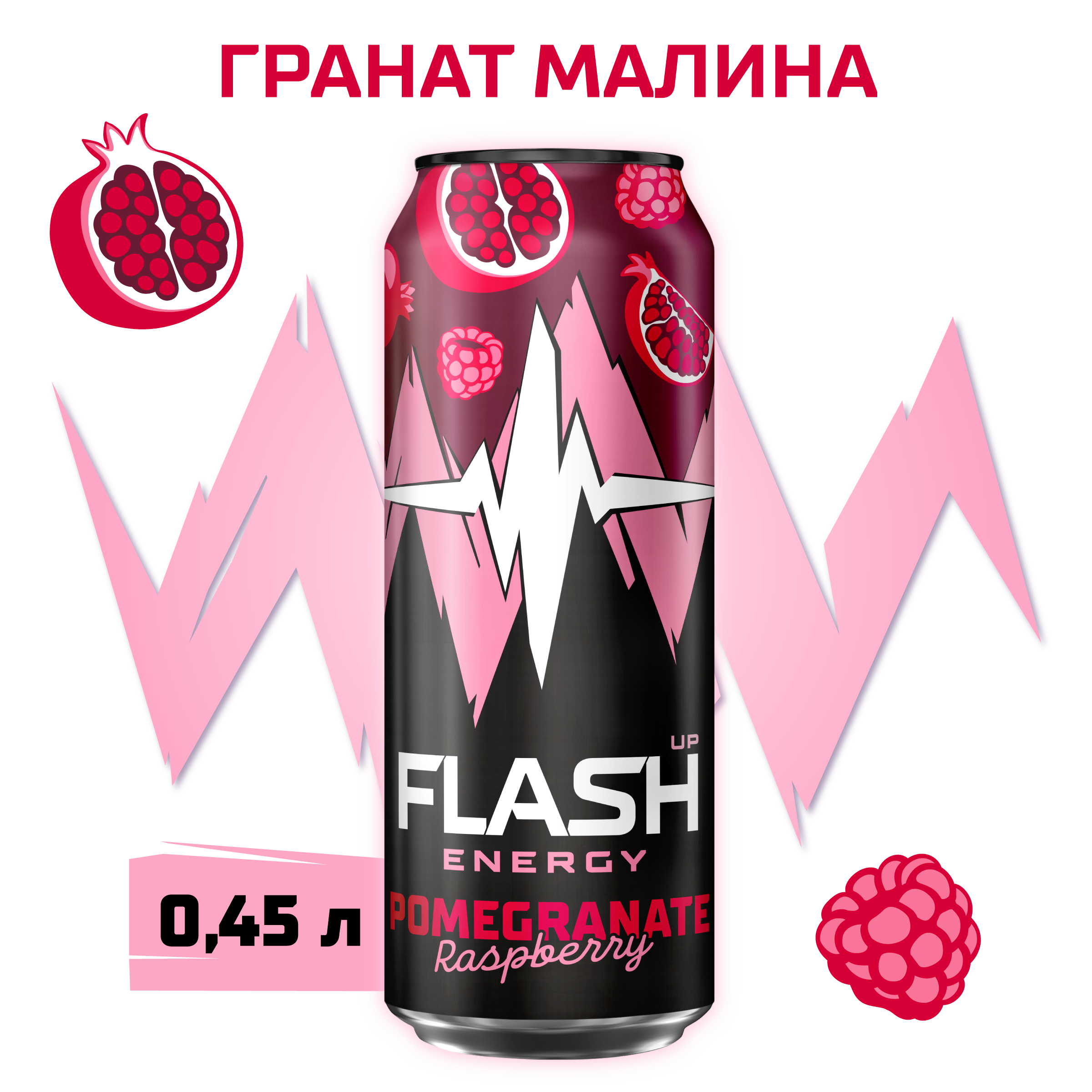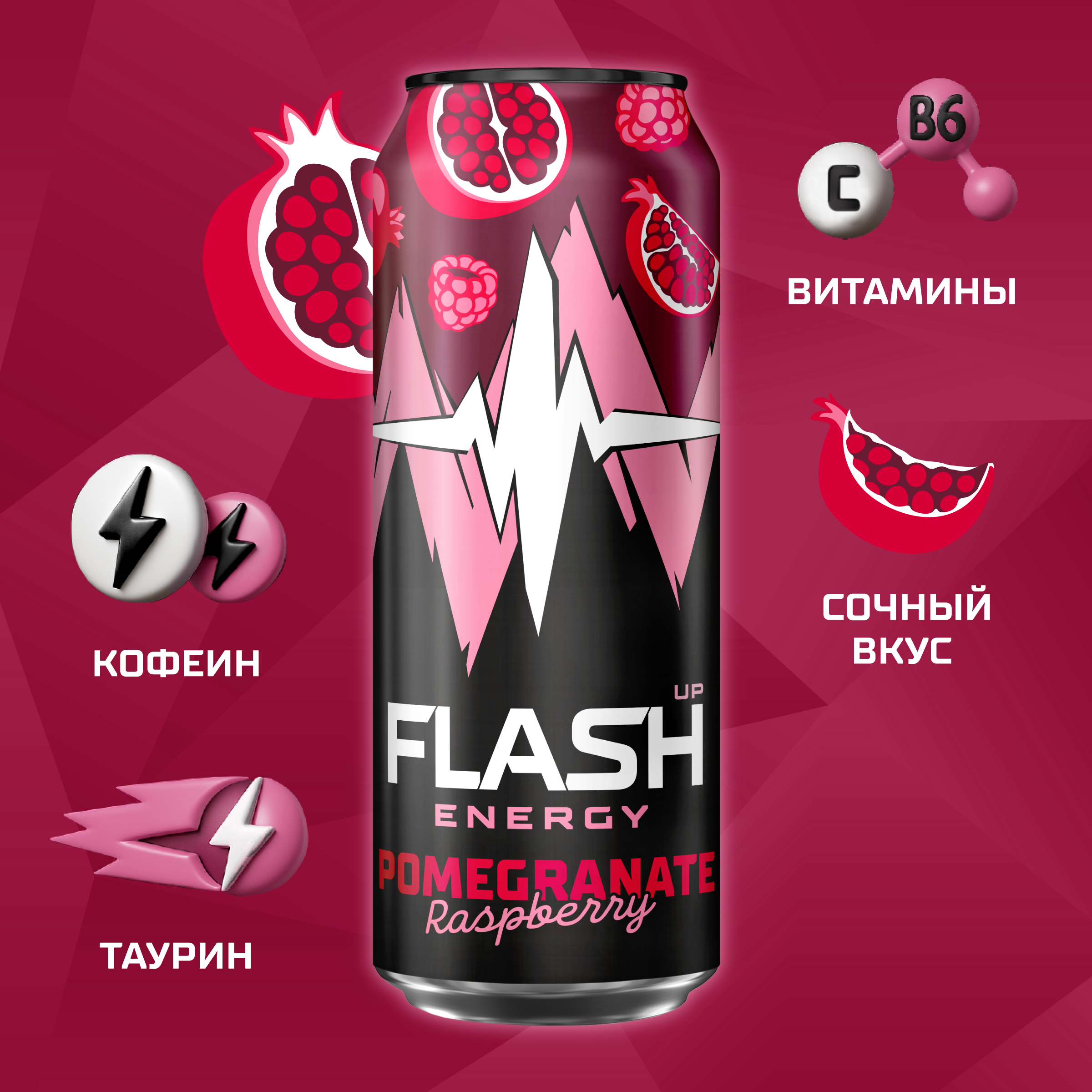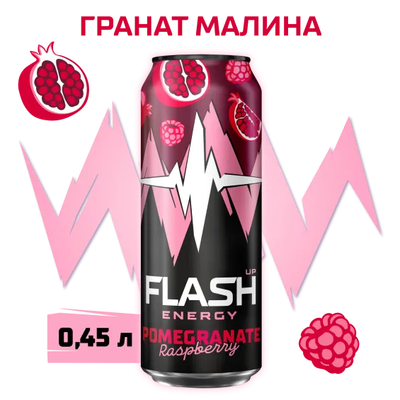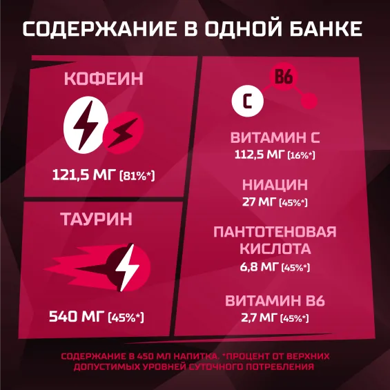 вода питьевая очищенная, сахар, концентрат для напитков «Энергия со вкусом граната и малины» (регулятор кислотности лимонная кислота, сахар, витамин C, кофеин, ароматизатор, ниацин, пантотеновая кислота, витамин B6, стабилизатор Е 415, фолиевая кислота), регуляторы кислотности: лимонная кислота и цитрат натрия, таурин, сок черной моркови концентрированный, антиокислитель аскорбиновая кислота, консерванты: сорбат калия и бензоат натрия.