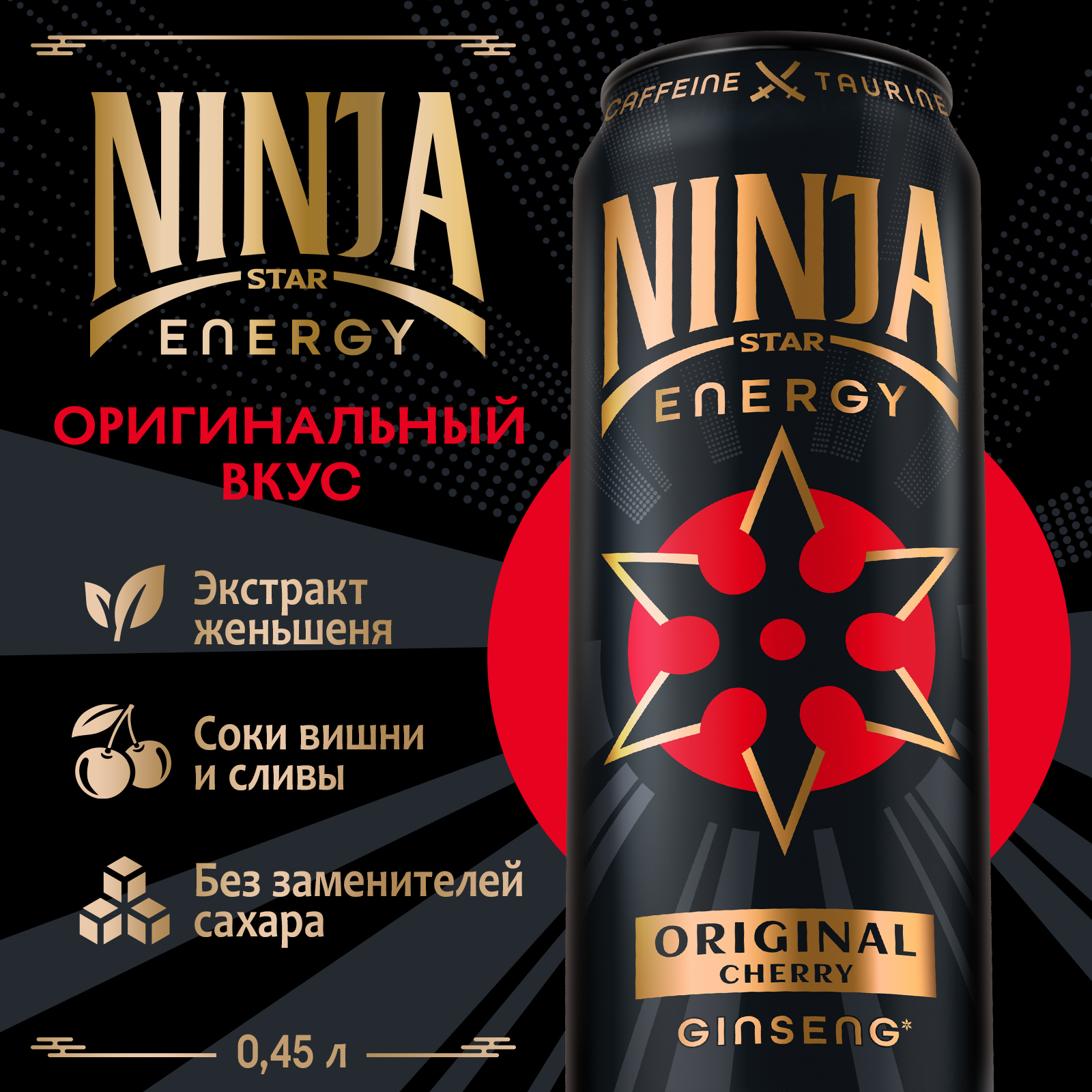 вода питьевая очищенная, сахар, регуляторы кислотности: кислота лимонная и цитрат натрия, добавка пищевая комплексная «Основа сокосодержащая Вишня-слива» (регулятор кислотности: Е330, Е300, таурин, вещества вкусоароматические, в том числе натуральные, кофеин, стабилизатор Е414, витамины: Никотинамид, D-пантотенат кальция, пиридоксина гидрохлорид, фолиевая кислота, соки концентрированные: вишни, сливы, консервант сорбат калия), таурин, сок черной моркови концентрированный, консерванты: сорбат калия и бензоат натрия, экстракт женьшеня