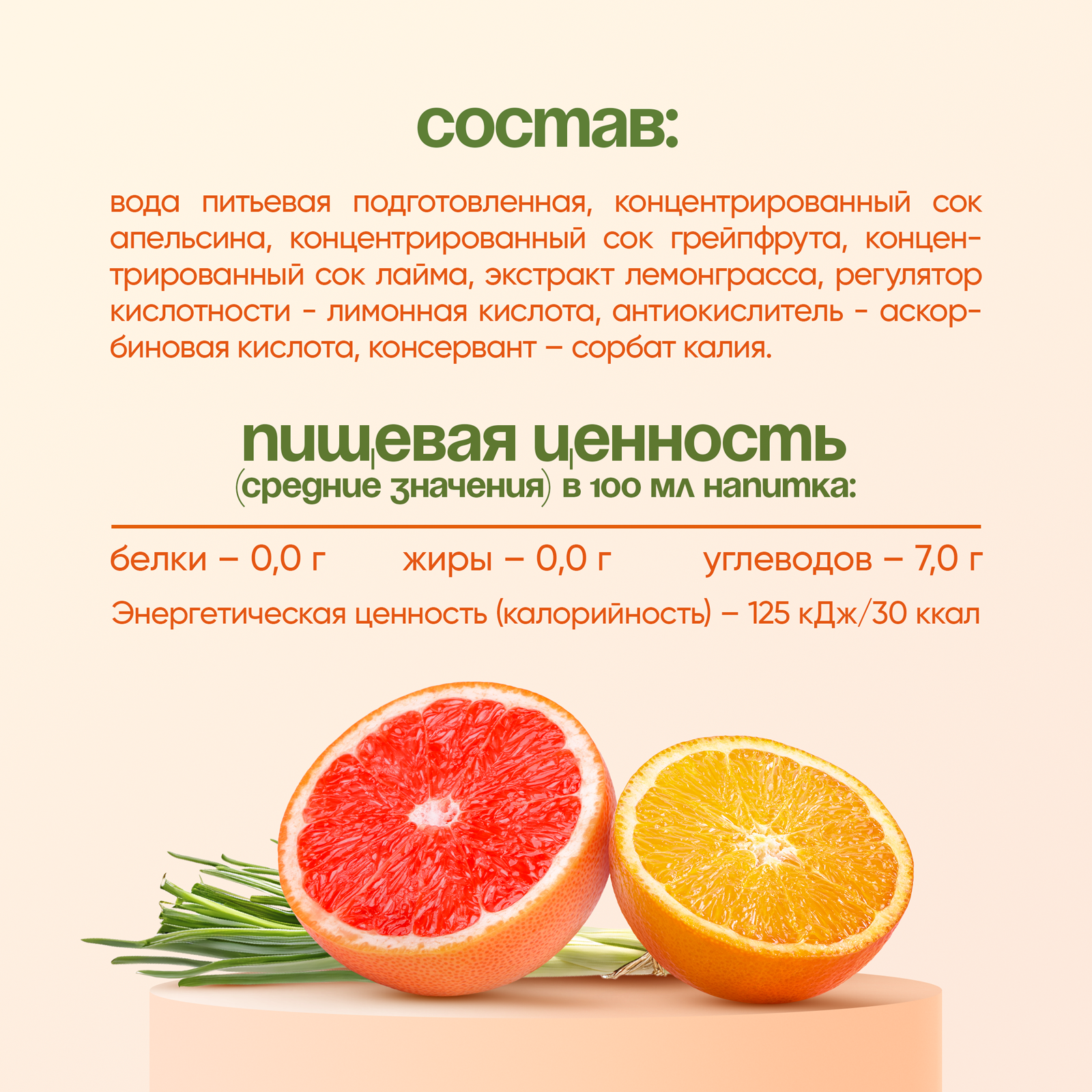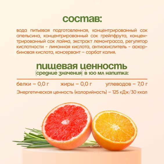 вода питьевая подготовленная, концентрированный сок апельсина, концентрированный сок грейпфрута, концентрированный сок лайма, экстракт лемонграсса, регулятор кислотности - лимонная кислота, антиокислитель - аскорбиновая кислота, консервант – сорбат калия