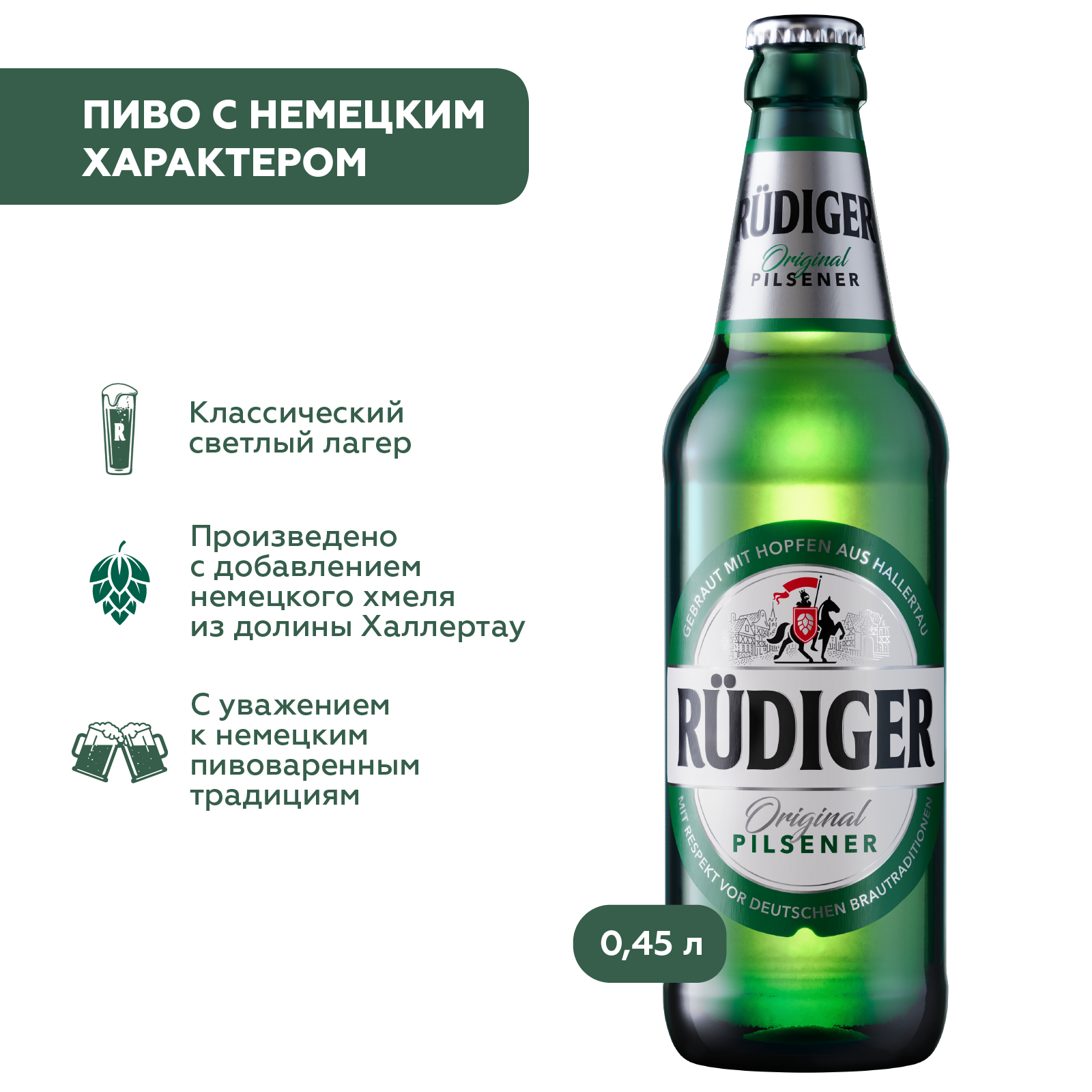 Rudiger Original Pilsener Бутылка 0,45 л доступна в магазинах при пивоваренных заводах «Балтика», а также с возможностью самовывоза.