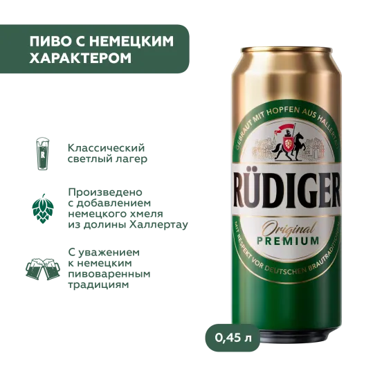 Rudiger Original Premium — подробнее"Rudiger Original Premium Банка 0,45 л – насыщенный вкус премиум пива!