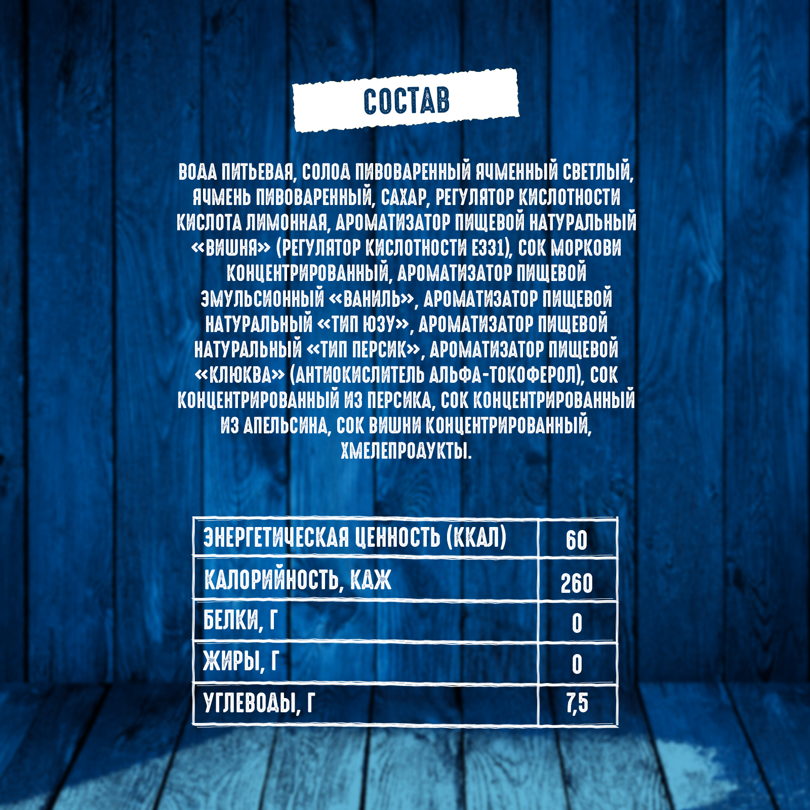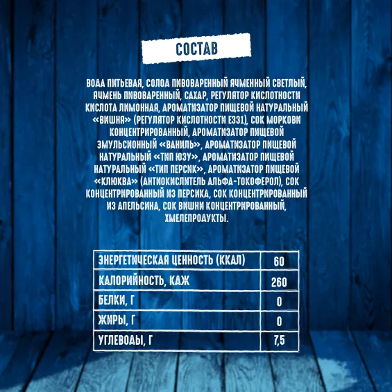 вода питьевая, солод пивоваренный ячменный светлый, ячмень пивоваренный, сахар, регулятор кислотности кислота лимонная, ароматизатор пищевой натуральный «Вишня» (регулятор кислотности Е331), сок моркови концентрированный, ароматизатор пищевой эмульсионный «Ваниль» (стабилизаторы: E414, E444, E445, регулятор кислотности Е330, консерванты: Е202, Е211), ароматизатор пищевой натуральный «тип Юзу», ароматизатор пищевой натуральный «тип Персик», ароматизатор пищевой «Клюква» (антиокислитель альфа-токоферол), сок концентрированный из персика, сок концентрированный из апельсина, сок вишни концентрированный, хмелепродукты.