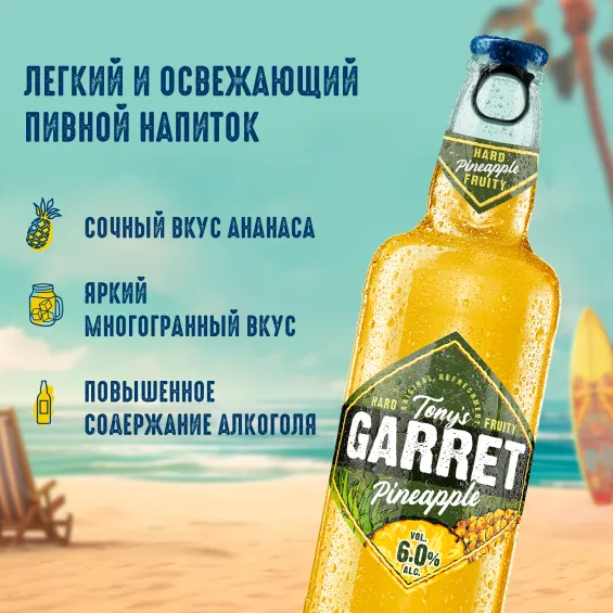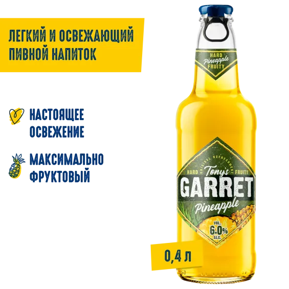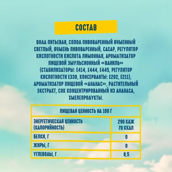 вода питьевая, солод пивоваренный ячменный светлый, ячмень пивоваренный, сахар, регулятор кислотности кислота лимонная, ароматизатор пищевой эмульсионный «Ваниль» (стабилизаторы: E414, E444, E445, регулятор кислотности Е330, консерванты: Е202, Е211), ароматизатор пищевой «Ананас», растительный экстракт, сок концентрированный из ананаса, хмелепродукты