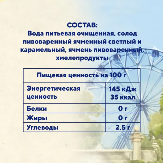 Светлый фильтрованный лагер c приятным солодовым ароматом и мягкой горчинкой, сваренный в советских подробнееСветлый фильтрованный лагер c приятным солодовым ароматом и мягкой горчинкой, сваренный в советских традициях пивоварения только из натурального сырья. Прекрасно освежает в жару и дарит приятное послевкусие